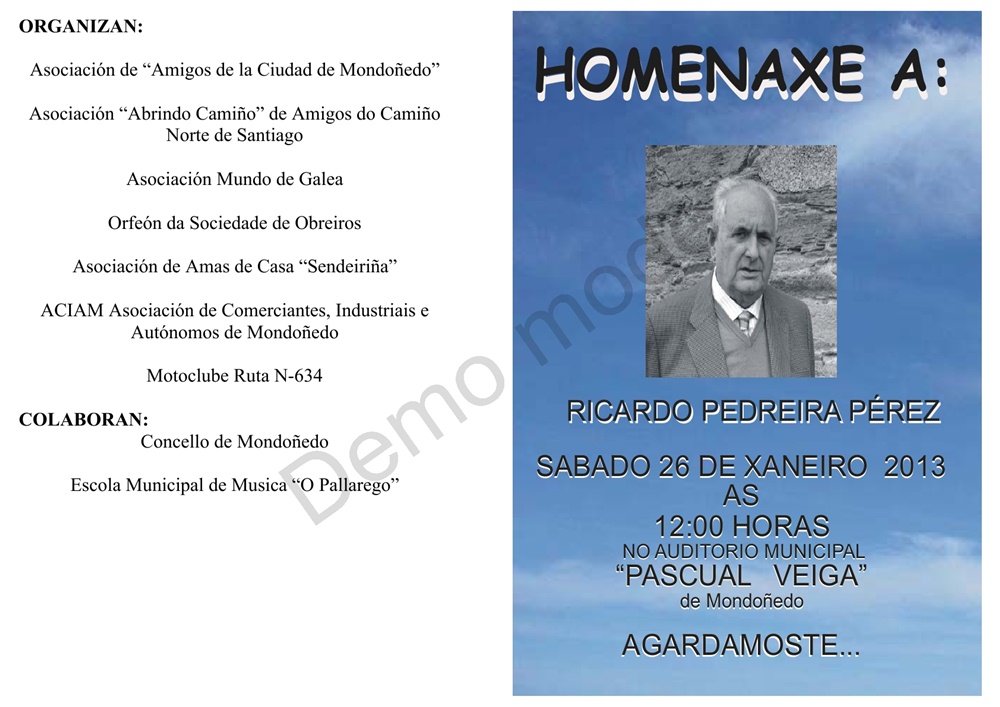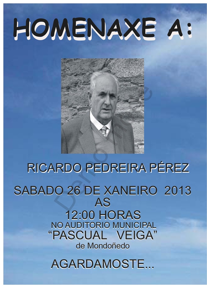 Este sábado 26 de enero se le ofrecerá un homenaje a Ricardo Pedreira Pérez en el Auditorio municipal Pascual Veiga, toda la información del evento en los carteles adjuntos que los puedes ver a pantalla completa haciendo clic sobre ellos.