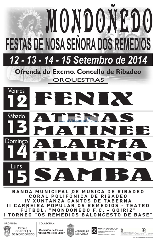 O programa de festas inclue actuación das orquestras como Fenix, Atenas, Matinee, Alarma, Triunfo e Samba. Ademais actuará a banda de música e a coral polifónica Ribadeo.